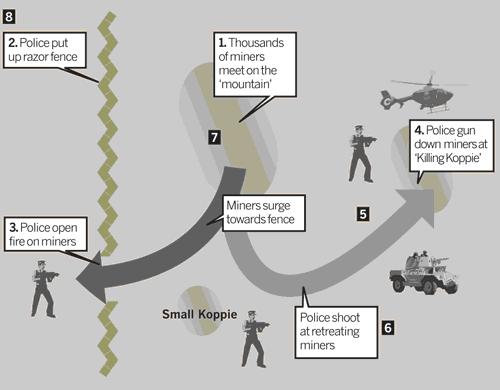 Wir befragten überlebende Minenarbeiter und schauten uns den realen Schauplatz des Massakers an. Was wir fanden, ist sogar schockierender als die Geschichte, die in den Medien präsentiert wurde, selbst hier in Südafrika. Folgende Ereignisse sind wie auf der Grafik nummeriert.